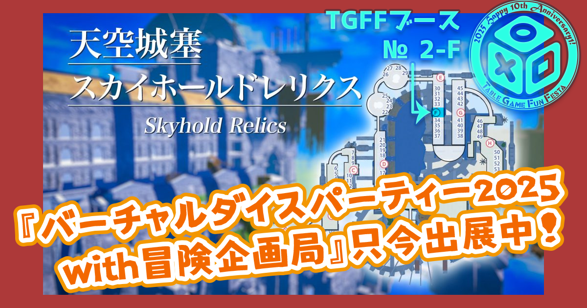 現在VR空間で開催中のVRアナログゲーム(ボードゲーム・TRPGなど)を中心とした展示会「バーチャルダイスパーティー2025 with 冒険企画局(以下、VDP2025)」にTGFFもブース出展させていただいています!(ブース№ 2-F)