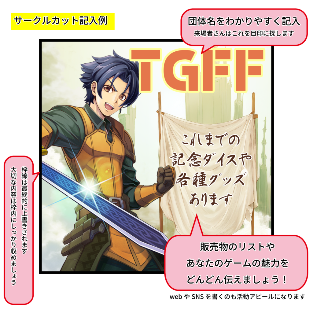 - ブース番号欄は不要: 今回より枠外に表示するため、カットスペースいっぱいに活動内容や頒布物をアピールしてください!