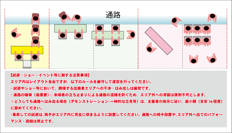 エリア内はレイアウト自由で試遊等可能ですが、以下のルールを厳守して運営を行ってください。