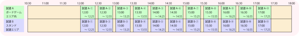 | 試遊前受付 | 開始5分前に『ボドゲ受付』にて出展者直前受付 ※簡単な注意事項と初回試遊希望者リストをお渡しします4 | 開始5分前に『スタンド試遊受付』にて出展者直前受付 ※簡単な注意事項と初回試遊希望者リストをお渡しします5 |