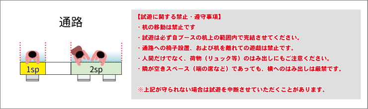- 着席しての試遊は、椅子がエリア内に完全に収まるように設置してください。通路への椅子設置や、エリア外へ出てのパフォーマンス・遊戯は禁止です。